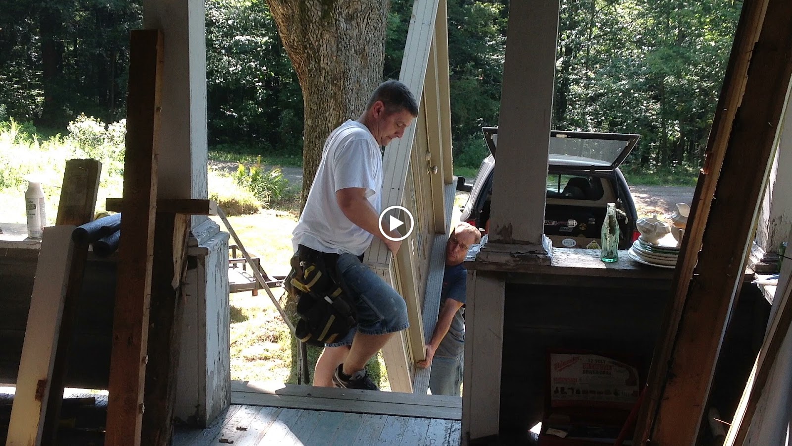 Saturday, August 8, 2015. The first thing on our agenda were the bees. The weekend before, we found bees in the kitchen wall. I was very excited about this. I wanted some honey! Our sweet cottage neighbor helped us with finding a local bee keeper. He was not interested in taking the bees but he knew someone who was. So first thing Saturday morning, they came out to check out the bees. It was interesting to watch them up close. The bees didn't seem to mind that they were being investigated. Trying to find how far up the hive goes, they pounded the kitchen wall and listened with a stethascope. They did not remove the bees that day, but went back on Monday. I still don't know if there is any honey.