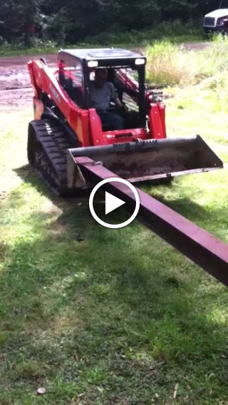 It was a play day for Superman today. His dad, Wilmer, drove the roll back, loaded with the skid loader, up to the cottage for us. After breakfast, the fun began. Superman scaped away some mud at the end of, what will be, the driveway. He leveled out an area around the fire pit. But the real reason for the skid loader was so he could drop a steel beam into the basement so he could level up the house.